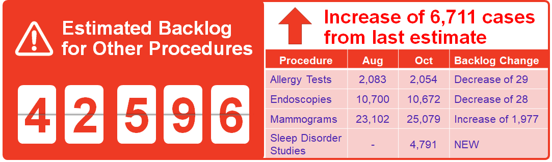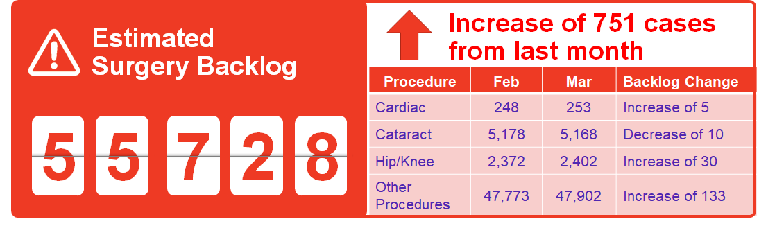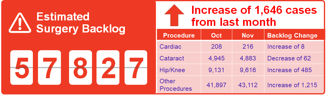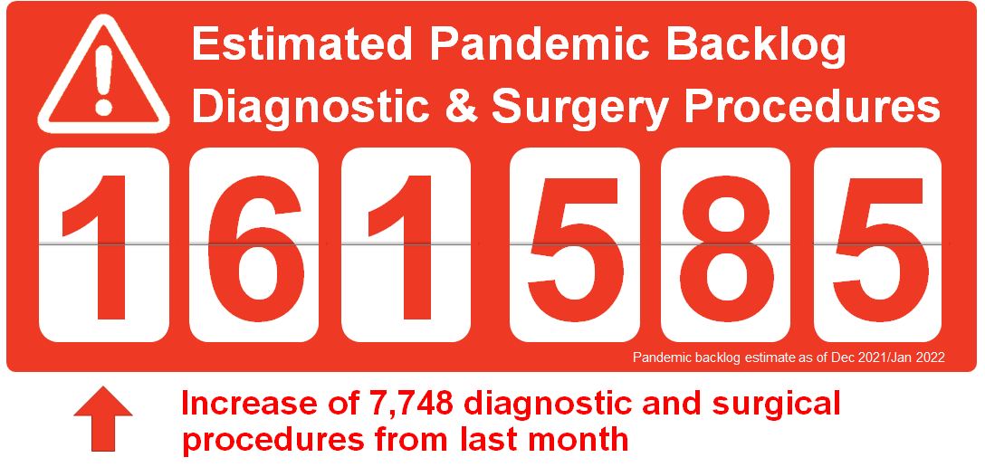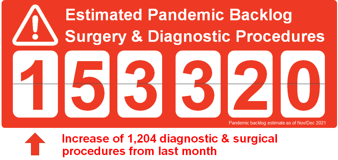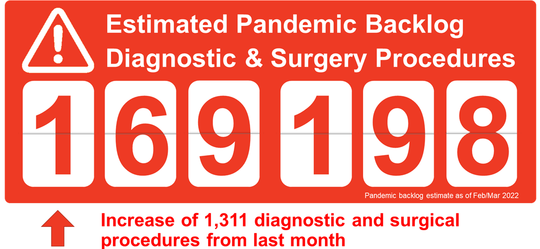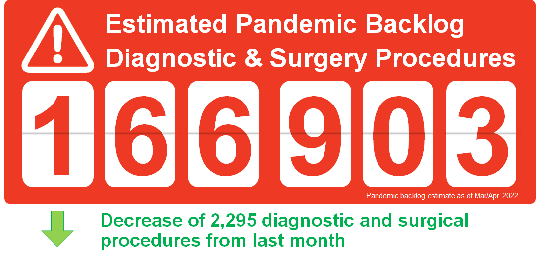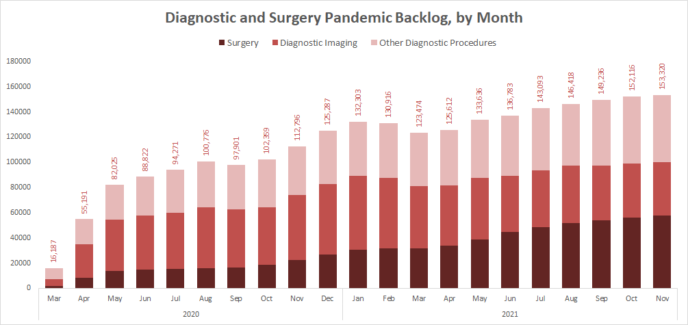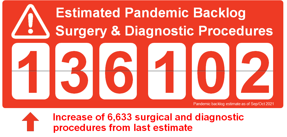 The surgery and diagnostic imaging estimates reported above do not include any backlog of wait list that existed before the COVID-19 pandemic was declared in March 2020. The backlog estimates only capture the pandemic period.