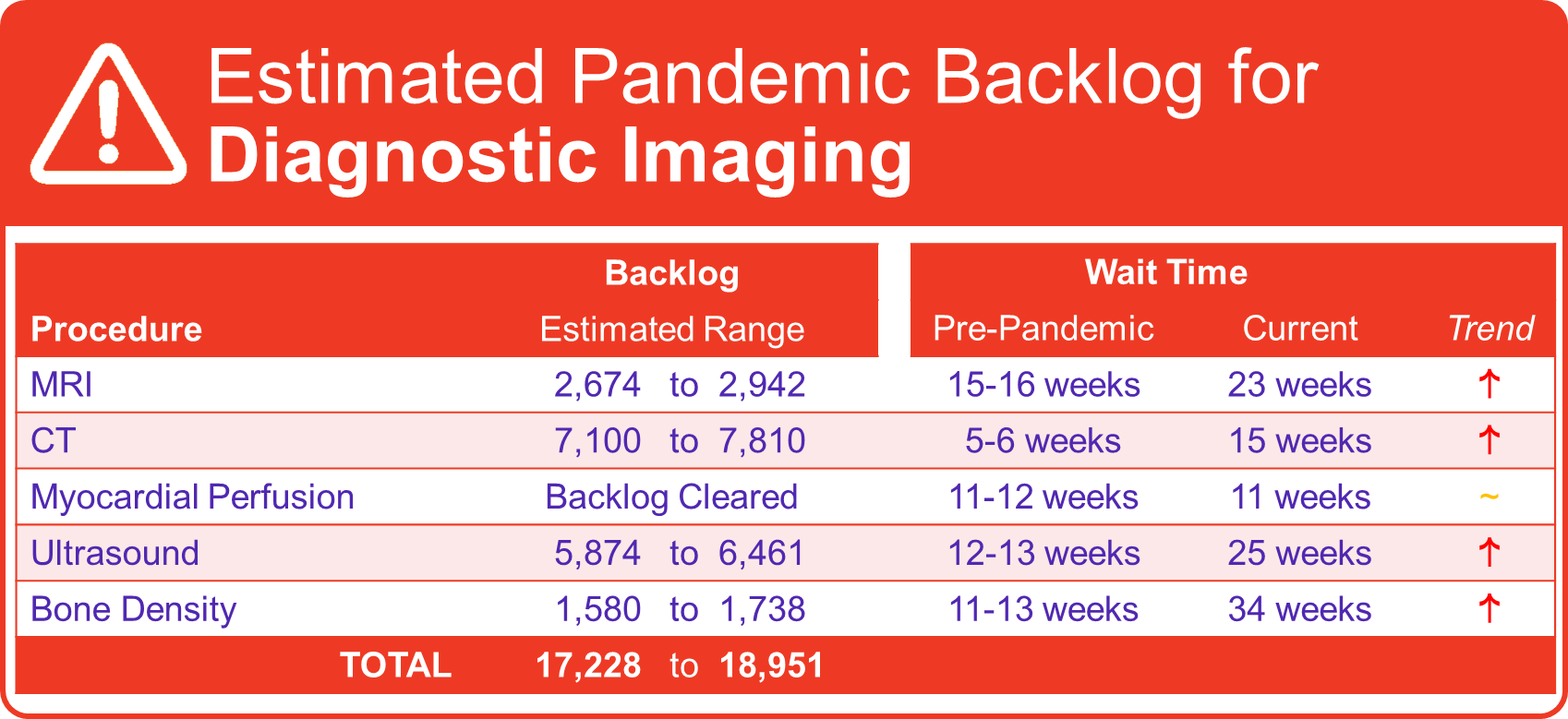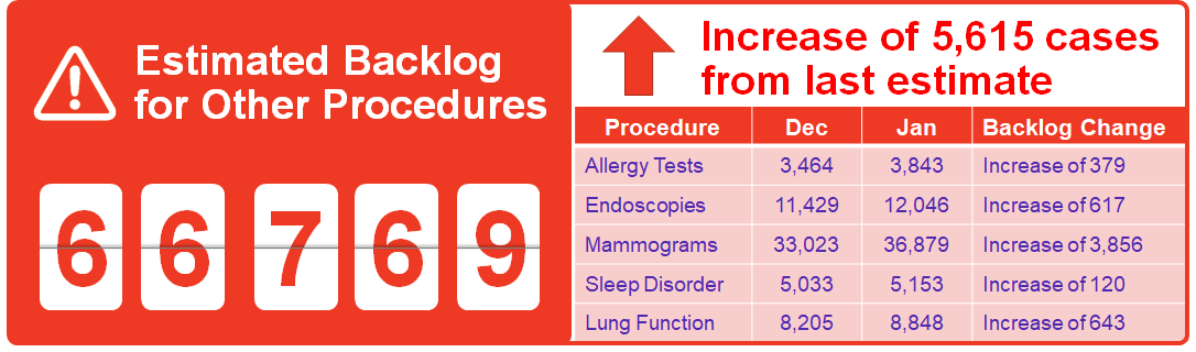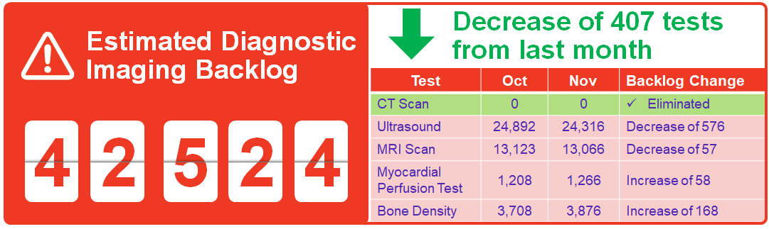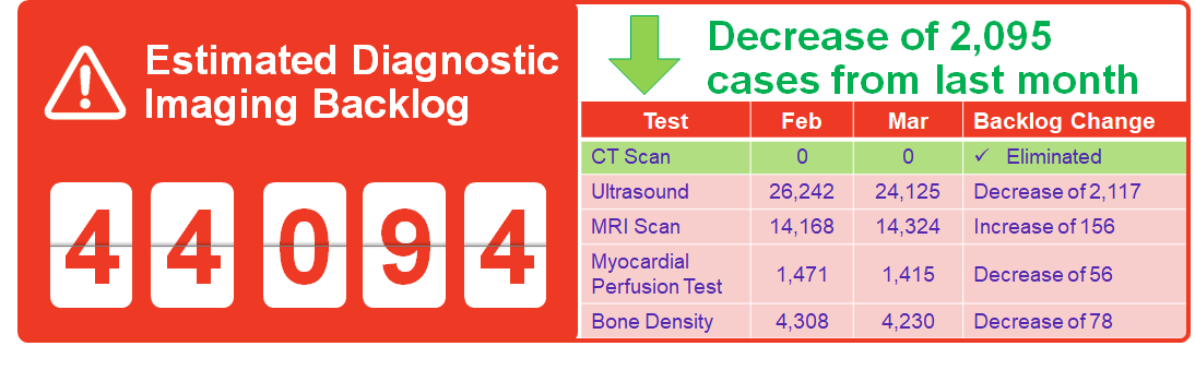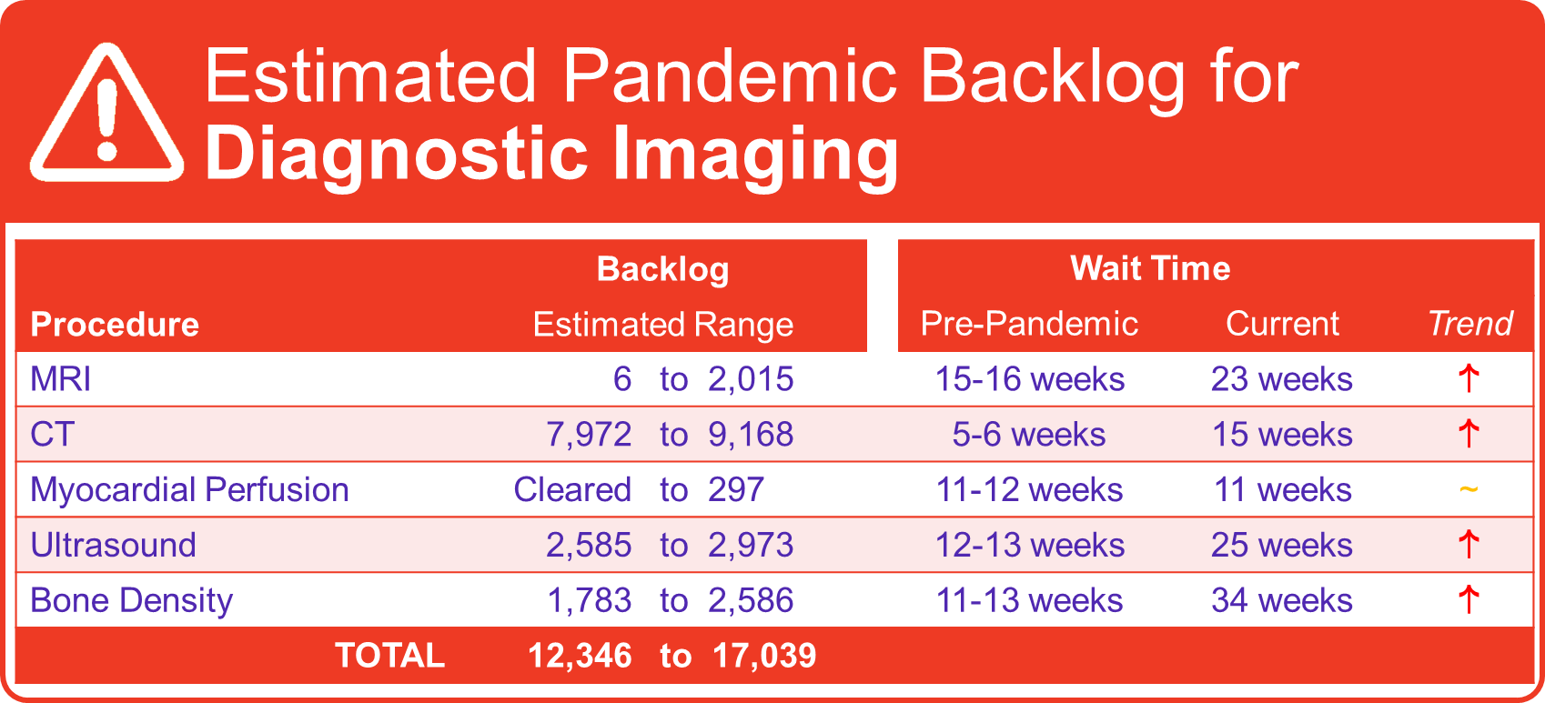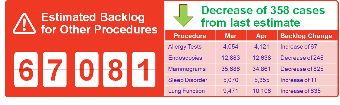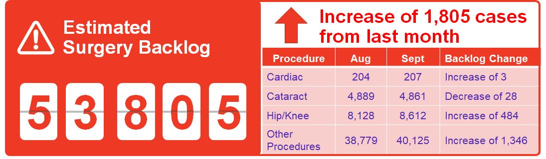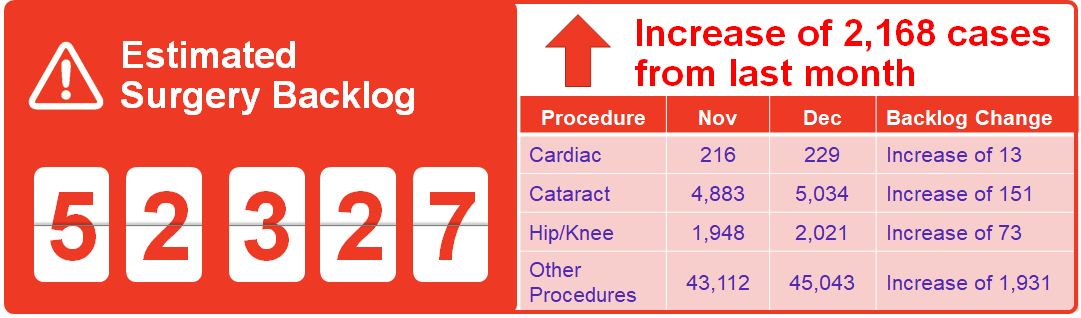The surgery and diagnostic imaging estimates reported above do not include any backlog of wait list that existed before the COVID-19 pandemic was declared in March 2020. The backlog estimates only capture the pandemic period.