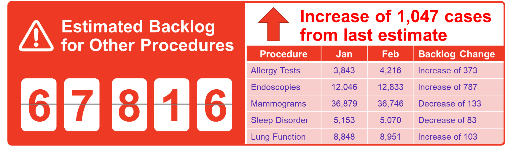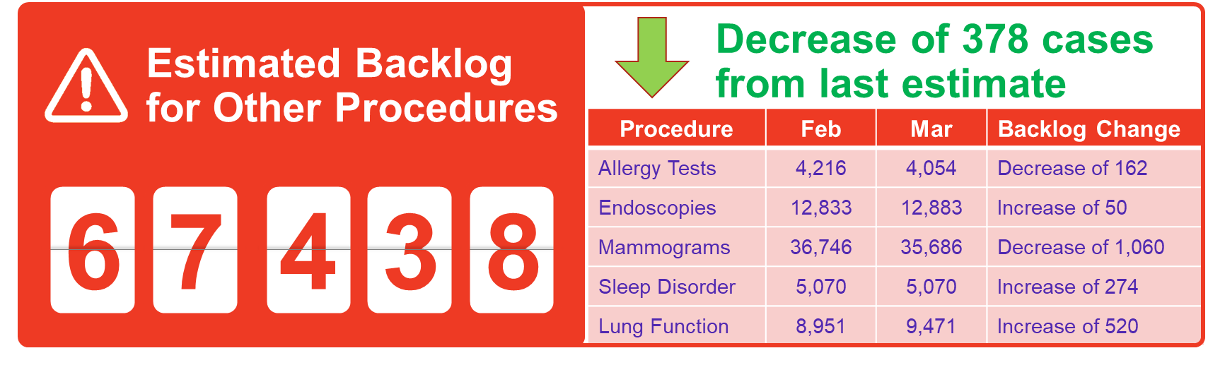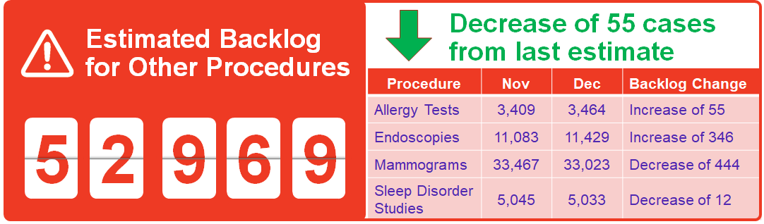 For all estimates, procedure volumes during the pandemic were compared with the same period for the year prior to the pandemic, and the difference is considered the backlog. In some cases, this was supplemented with other data and insights to develop and update these estimates. Because the pandemic has also delayed referrals for surgery and diagnostics, creating a secondary hidden backlog, our estimates attempt to include this for a more complete picture.
