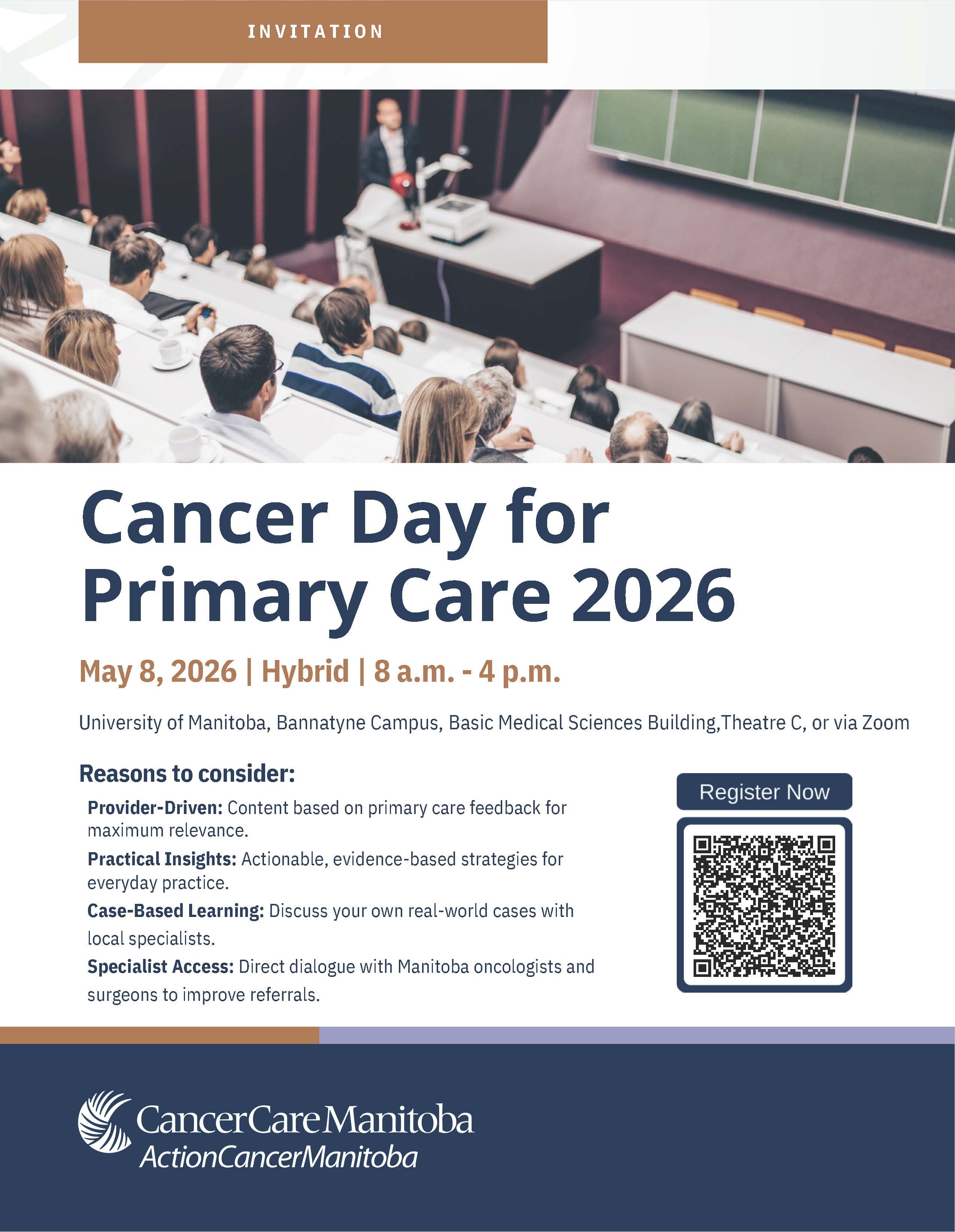 By improving knowledge and communication between primary care and cancer specialists, the event supports early detection, timely referrals, and better patient experience outcomes across Manitoba. This professional development event aligns with CCMB’s Refreshed Roadmap to Cancer Control for Manitoba 2025 across all priority areas.