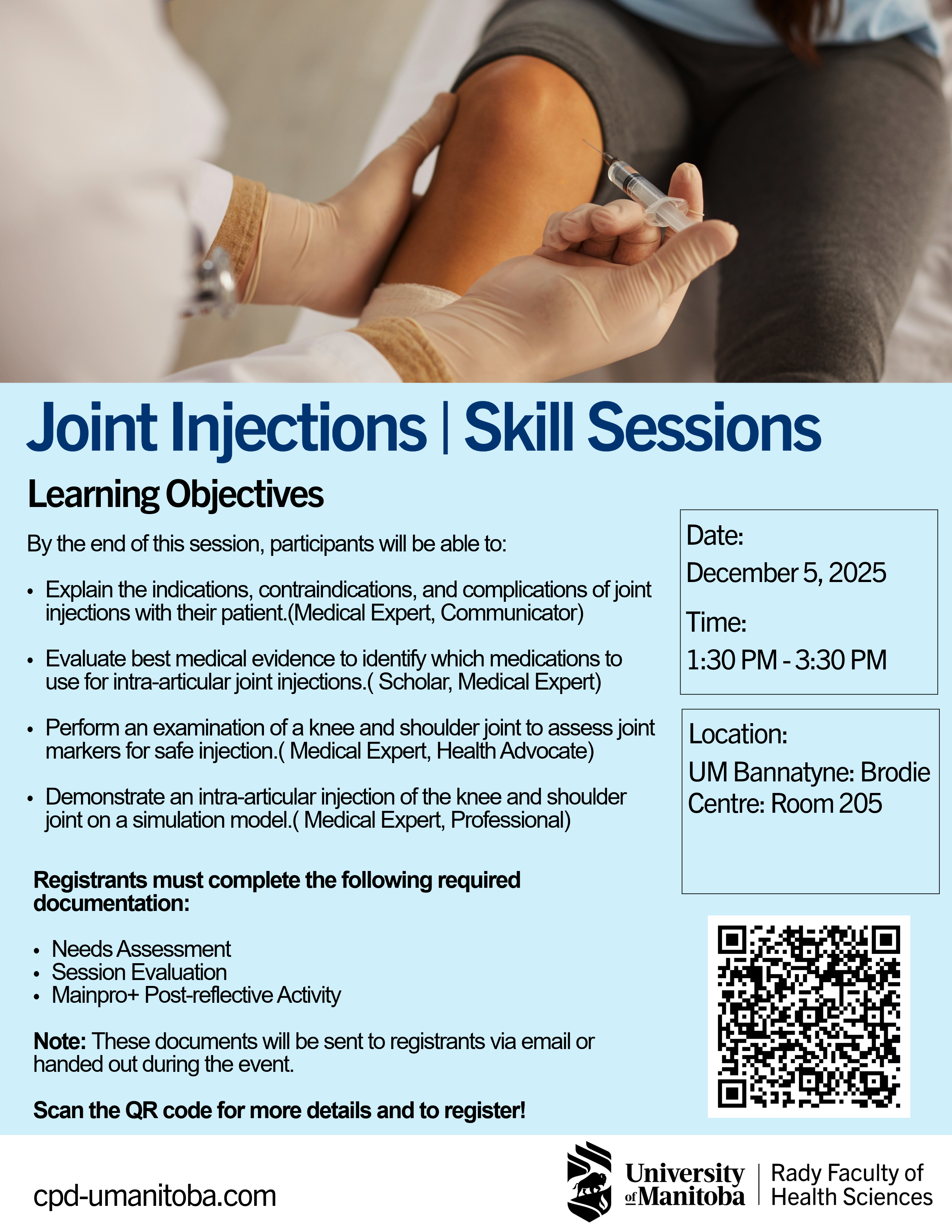 Participants will engage in a practical, evidence-based session focused on the assessment and management of joint conditions through intra-articular injections. The session explores the indications, contraindications, and potential complications of joint injections, with an emphasis on effective patient communication and shared decision-making. Learners will evaluate current medical evidence to guide appropriate medication selection for intra-articular use. Hands-on components include focused physical examinations of the knee and shoulder to identify anatomical landmarks and ensure safe injection practices.